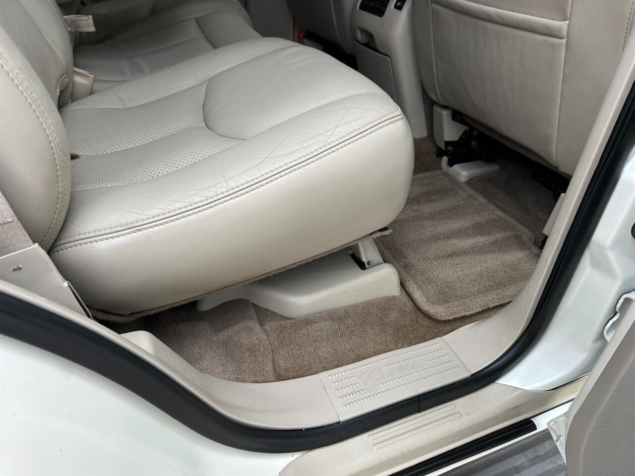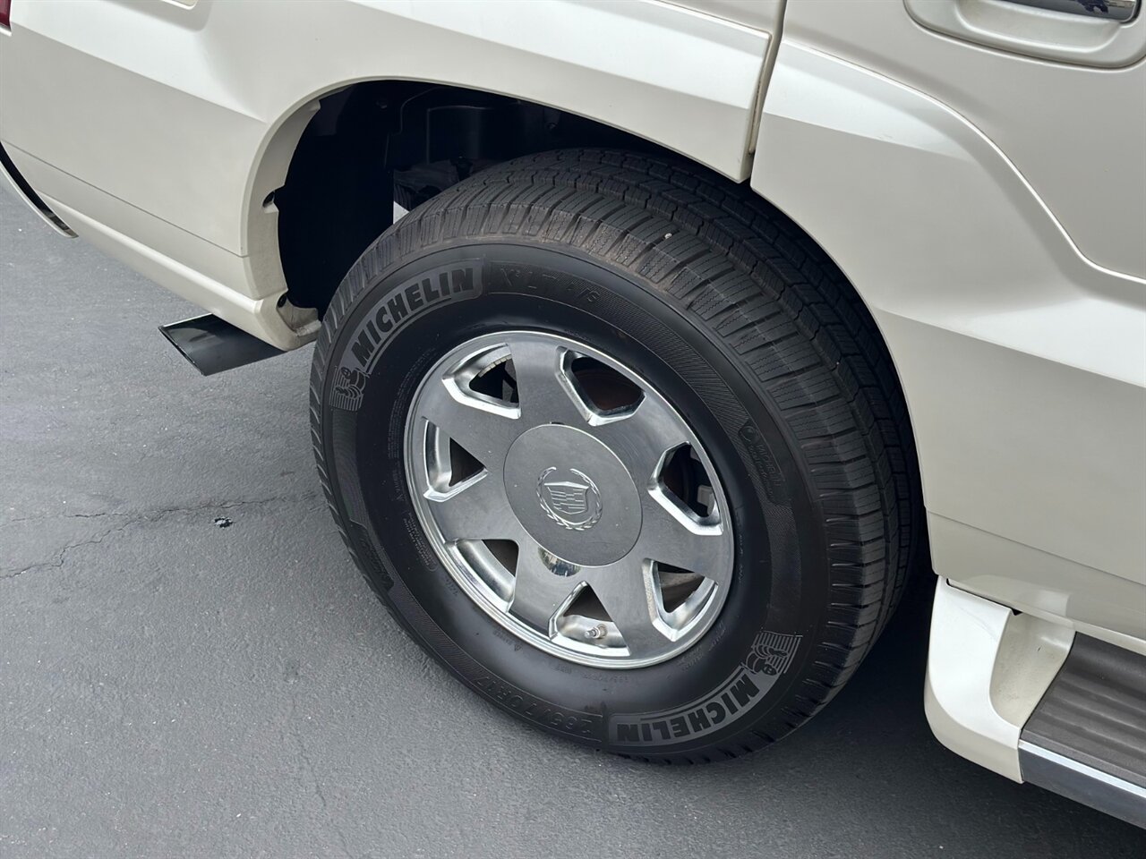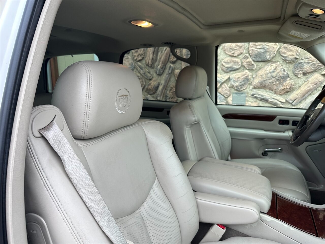 2005 Cadillac Escalade AWD 6.0L — LOW MILES — White Diamond exterior / Shale interior This clean, low-mileage Escalade mixes classic Cadillac luxury with the presence and capability you expect from a full-size SUV. Powered by a naturally aspirated 6.0L OHV V8 (16-valve) and full-time AWD, it delivers strong low-end torque for confident passing, towing, and all-weather driving. With well under 102,000 miles (averaging less than 5,000 miles per year) and an overall excellent condition, this Escalade is a great example of a cared-for luxury SUV. Highlights - Engine: 6.0L NA V8 (OHV, 16V) - Drivetrain: All-wheel drive - Exterior color: White Diamond - Interior color: Shale leather - Mileage: Below 102,000 miles (˜ <5,000 miles per year) - Fuel economy: EPA-style estimate about 12 MPG city / 16 MPG highway - Condition: Excellent overall Optional features included - In-dash CD player - Power moonroof (slides and tilts for added light and ventilation) - Eye-catching chrome wheels Factory-equipped features (detailed) - Luxury seating and trim: Plush Shale leather seating surfaces with supportive bolstering up front, refined woodgrain-style trim accents, and well-appointed fit-and-finish throughout the cabin. Power-adjustable front seats with lumbar support provide comfortable long-distance driving, and heating elements in the front seats keep you warm on chilly mornings. - Passenger capacity and flexibility: Spacious three-row seating with a versatile second/third row layout that folds for expanded cargo area when needed. Large door openings and a roomy interior make loading passengers and gear easy. - Climate comfort: Automatic climate control designed to keep the cabin comfortable in all seasons. Rear climate controls help keep back-seat passengers comfortable on longer trips. - Convenience features: Power windows and power door locks, remote keyless entry, cruise control, and a convenient center console and well-placed storage compartments for everyday practicality. - Audio and connectivity: Factory audio system tuned for the cabin’s acoustics, complemented here by the included in-dash CD player for music and media playback. - Exterior and lighting: Characteristic Cadillac grille and styling, bright finish door handles and trim, and powerful headlamps for confident night driving. The included moonroof adds a premium open-air option. - Safety and control: Antilock brakes (ABS) and traction-enhancing systems to help maintain control in slippery conditions, multiple airbags providing occupant protection, and a sturdy, engineered frame built for passenger safety. Electronic aids tailored to a full-size luxury SUV deliver predictable handling and stability. - Towing and capability: Robust V8 power and a heavy-duty suspension provide towing capability and composed highway cruising, while the AWD system improves traction on wet or uneven roads.